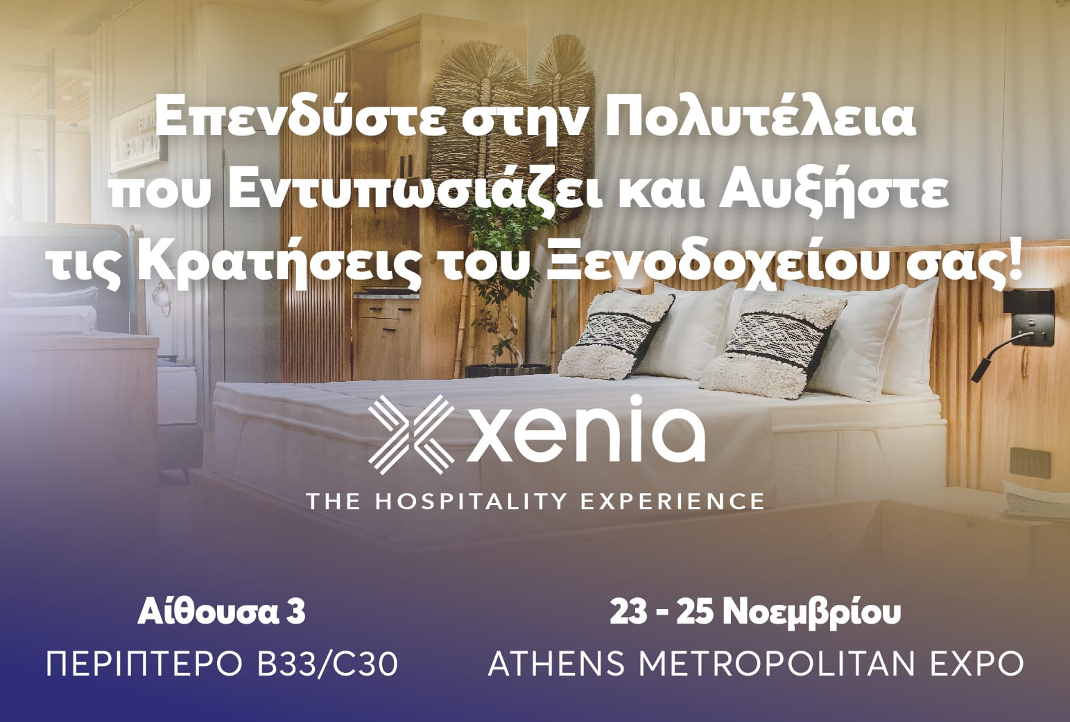 Μην χάσετε την ευκαιρία να μας γνωρίσετε από κοντά στην έκθεση Xenia που θα λάβει χώρα 22 έως 24 Νοεμβρίου στο Athens Metropolitan Expo στα Σπάτα Αττικής. Είναι μία premium έκθεση στοχευμένη αποκλειστικά στους ξενοδόχους αλλά και στους επαγγελματίες του ευρύτερου ξενοδοχειακού κλάδου..